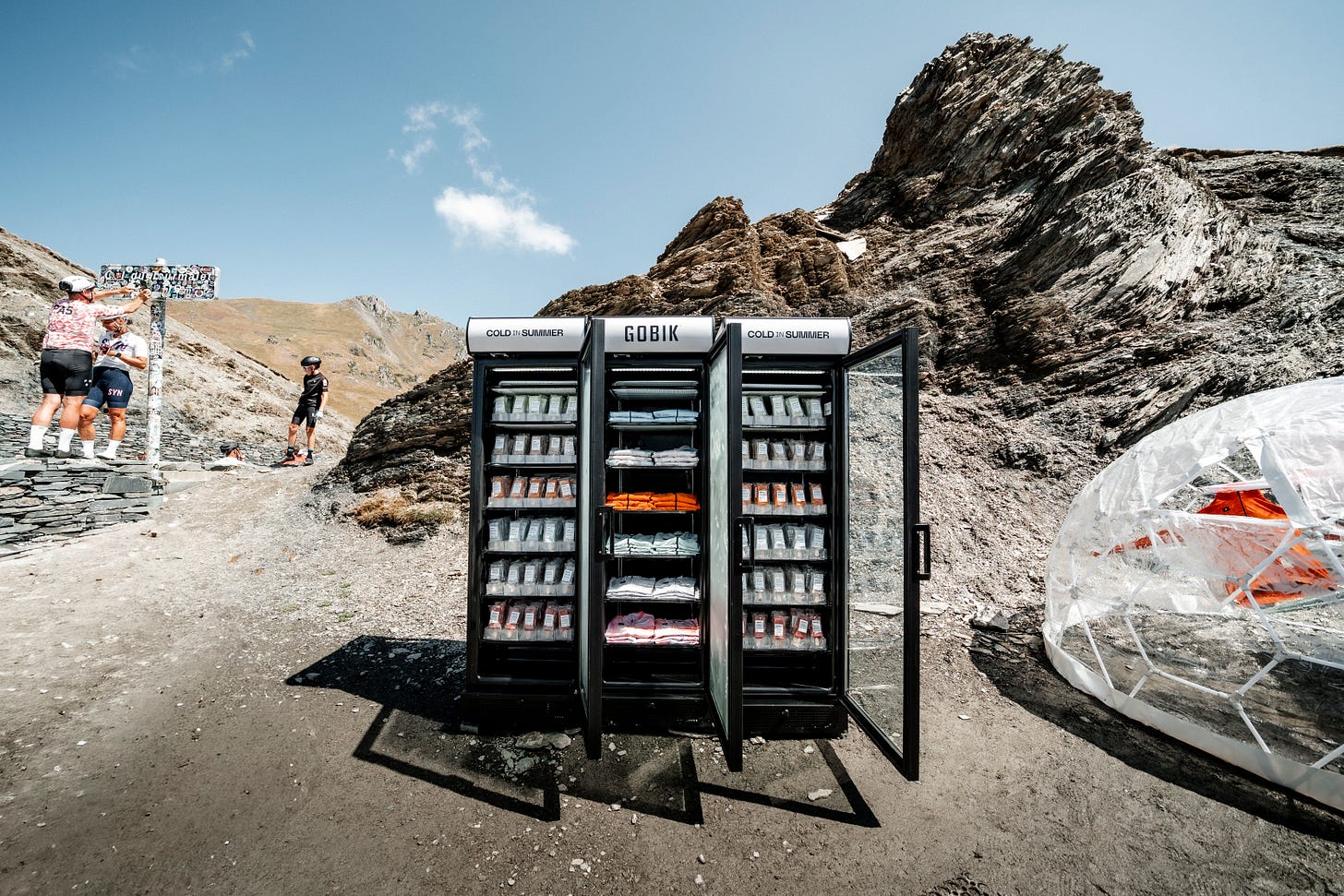 To celebrate the launch, Gobik carried out a unique action titled Cold in Summer on one of cycling’s most iconic climbs, the Col du Tourmalet. In the middle of a European heatwave, riders and fans were greeted with an unexpected contrast: ice cream popsicles in the colors of the new jerseys and a preview of the collection inside two transparent igloos installed at the mountain summit.