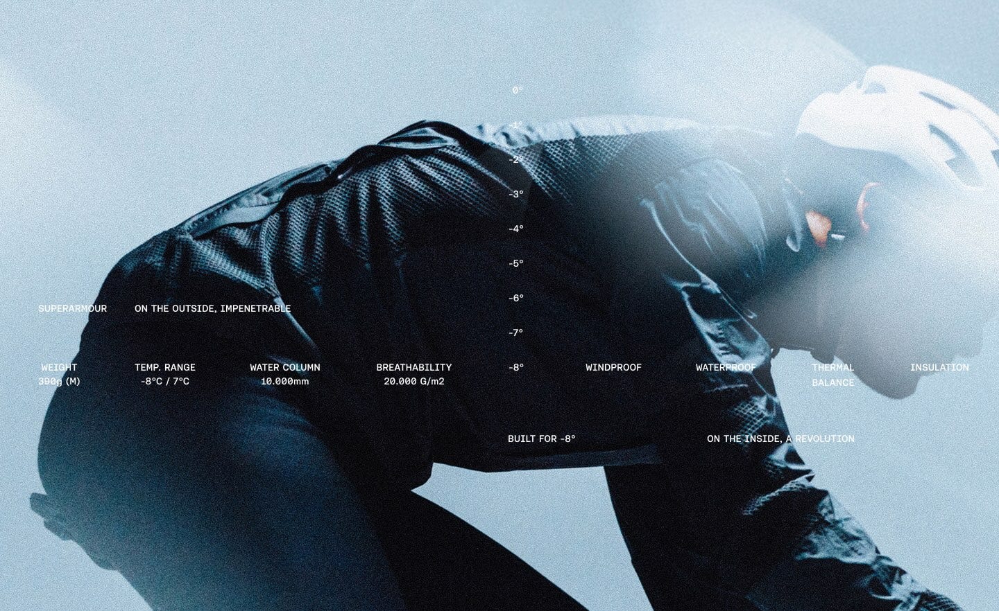 Engineered for low and very low temperatures — from -8°C to +7°C — the Superarmour excels how cyclists face the coldest, wettest, and windiest conditions. Its advanced dual-layer system keeps constant warmth, controlled breathability, and a remarkable sense of lightness.