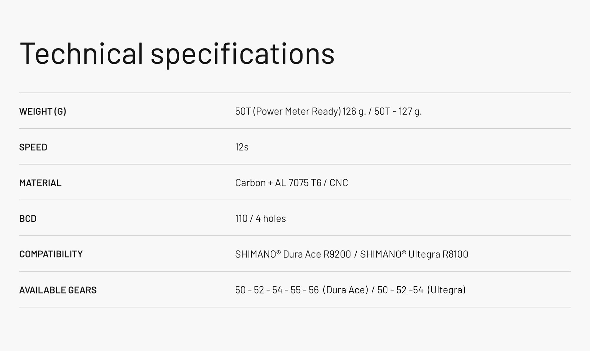 The X2 RD R92 and the X2 RD R81 stem from the same vision but are designed for different targets. The R92 has been designed explicitly for Dura-Ace 9200 cranksets, offering the broadest range of chainring options, from 50 to 56 teeth (50, 52, 54, 55, 56). The R81, on the other hand, is designed for Ultegra 8100 cranksets with three dedicated configurations: 50, 52, and 54 teeth, while maintaining the same design philosophy.