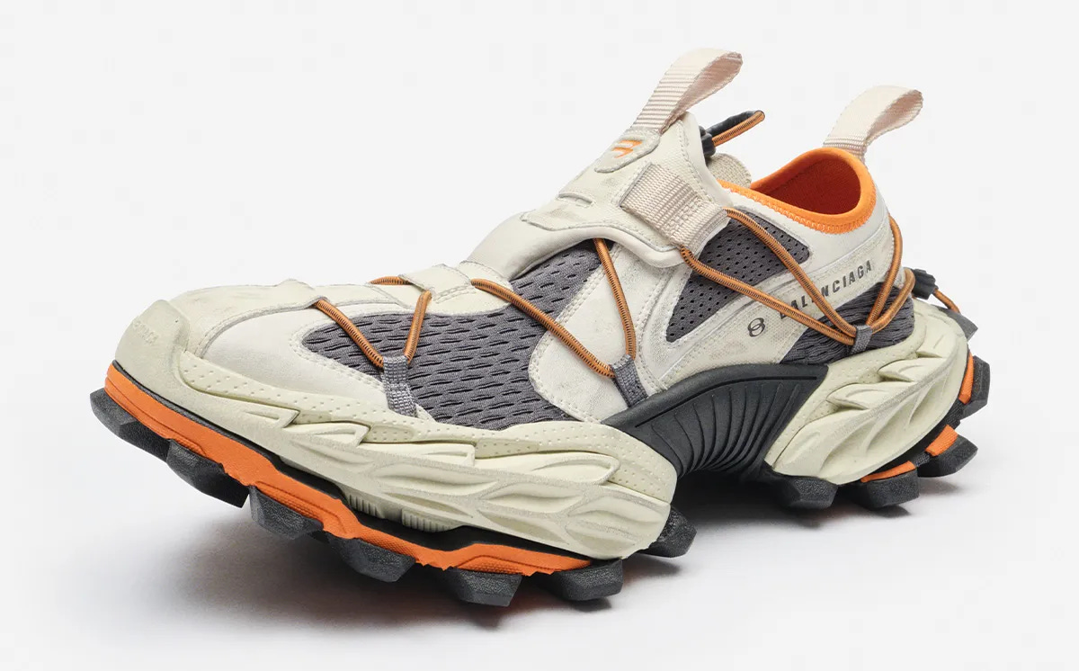 This new style, rooted in outdoor performance footwear, distorts and reimagines elements characteristic of technical hiking shoes to create a fresh take on an archetypal style. Its rugged, layered midsole and outsole, defined by prominent lugs, provide traction and comfort for all terrains.